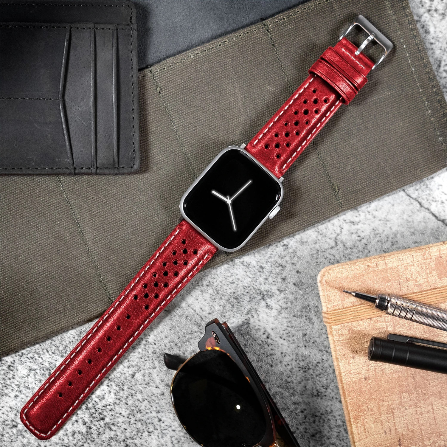 Skillfully crafted to evoke the nostalgia of 1960s & 1970s speed and motorsport, our Horween Racing Collection pairs perfectly with any series of the Apple Watch. The distinguishing perforations, originally designed to create a breathable strap for racetrack drivers, now makes a signature statement on your wrist. Our version features Dublin Horween® leather, 316L stainless steel or black PVD hardware, and a soft top-grain Nubuck lining.