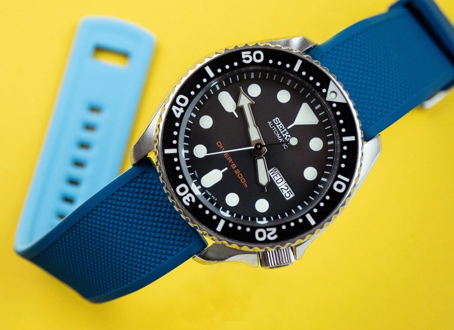 Our two-toned blue ‘Flatwater’ Elite Silicone Quick Release watch straps feature a premium textured top, 316L surgical grade brushed stainless steel buckle and a 2mm taper from watch head to buckle. Each band also comes standard with two included lengths to assure they will be a perfect fit for nearly anyone. Swap out in just a few seconds and without tools! Pair this silicone rubber watch band with our Leather or Canvas quick release bands to take full advantage of the opportunity to ‘Switch it Up’ on the go.