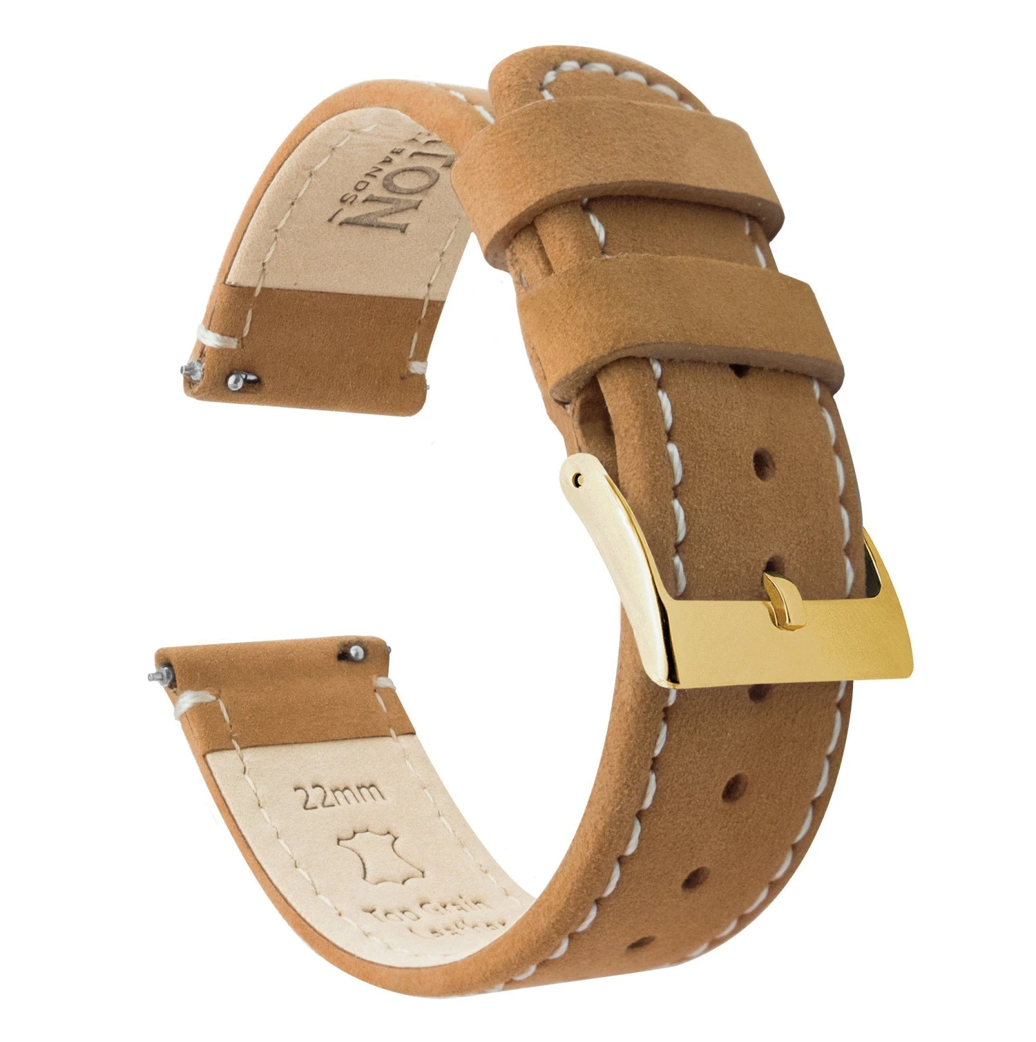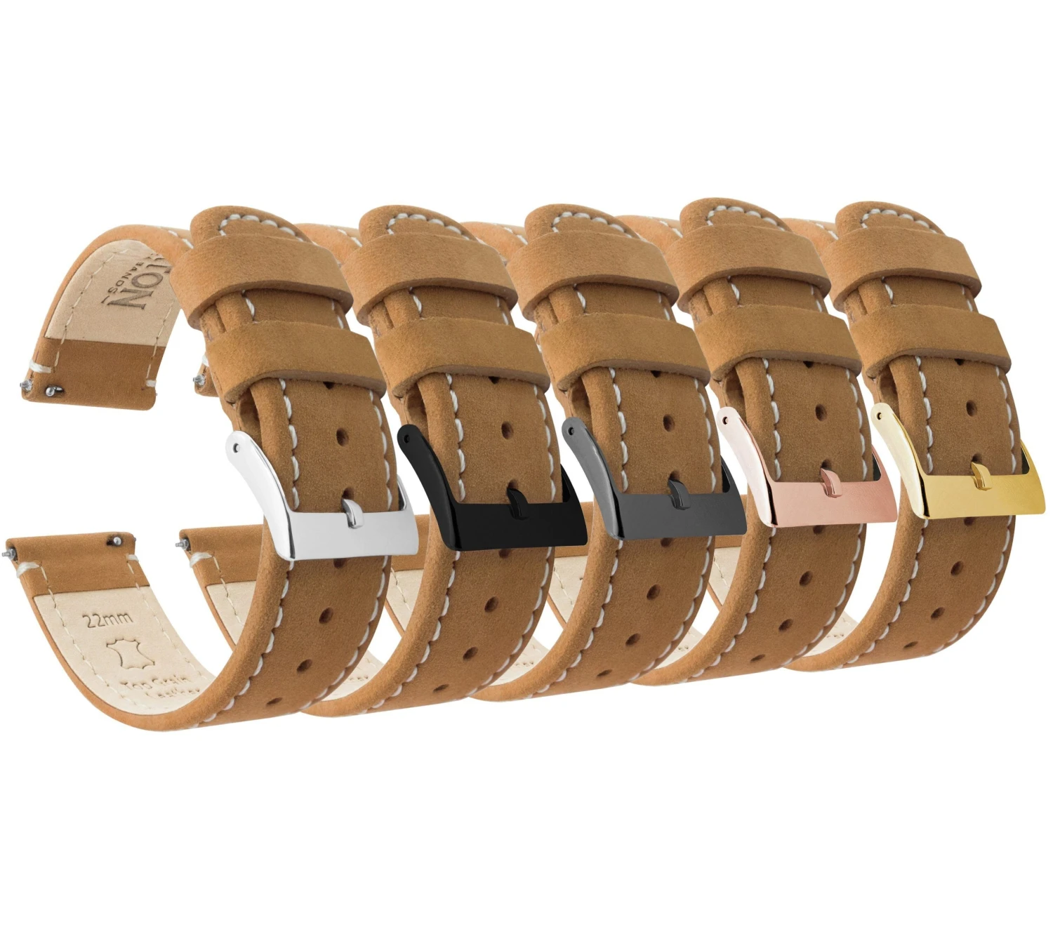 Our gingerbread brown Leather Quick Release watch bands install in less time than it takes to shake a martini. Crafted from hand-selected top grain leather, this truly is “The Strap Your Watch Deserves”. Pair this light brown leather watch strap with our Silicone or Canvas Quick Release to take full advantage of the opportunity to ‘Switch it Up’ between your workplace and the gym.