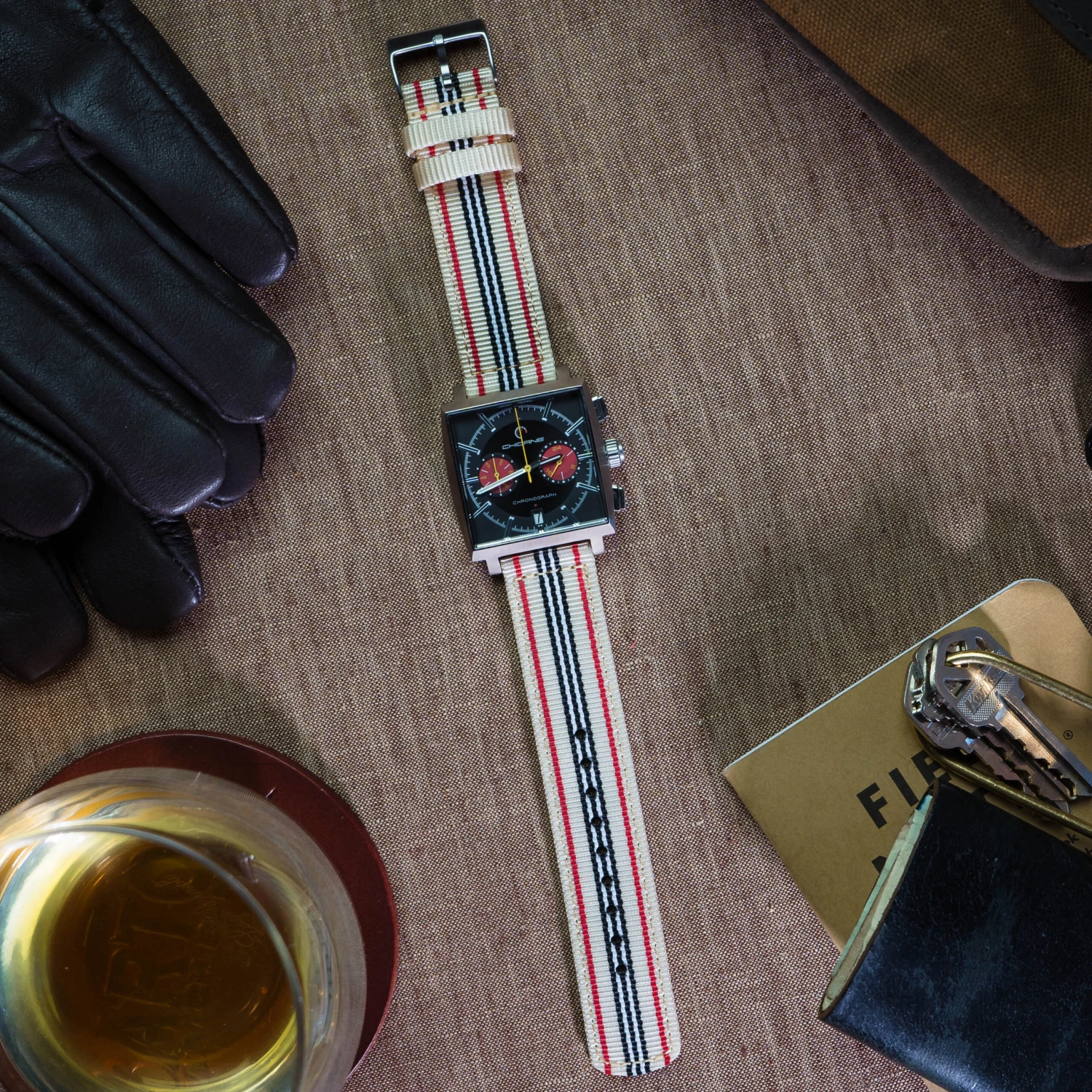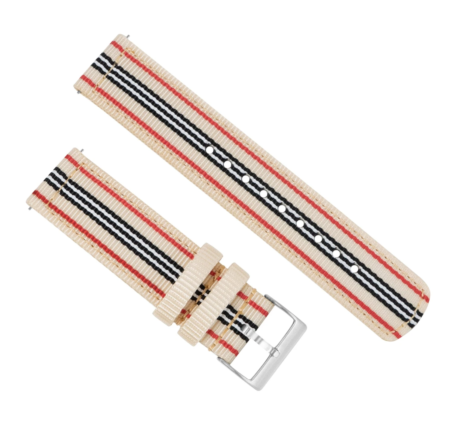 Our Two-piece NATO-style straps allow you to enjoy the classic look of a NATO-style strap without having to forego the quick-release functionality. These nylon watch bands are water-resistant, colorfast, and feature two nylon keeper loops for a more comfortable fit. Please be aware that due to the sturdy dual-layer construction, our two-piece NATO-style straps do have a stiffer feel that softens up over time. As always, these feature 316L stainless steel hardware with a brushed finish and quick release spring bars. Add some color to your strap collection with our selection of fun twelve colors and patterns.